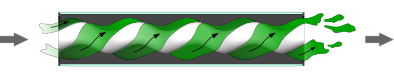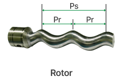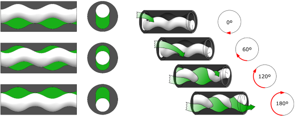 When the rotor rotates one revolution(360°), the cavity between the rotor and the stator progress by one pitch of the stator (2 pitches of the rotor) and the total crosssectional area A of the cavity is uniform in any position.