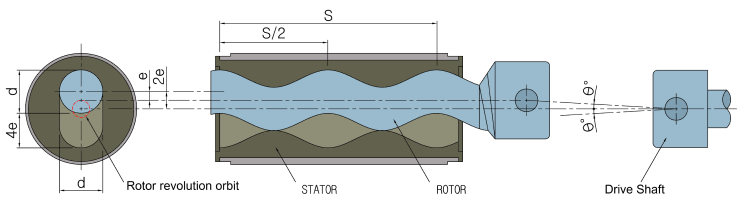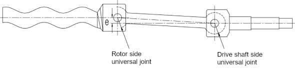 The rotor eccentrically revolves with a constant eccentricity “e”from the centerline of the drive shaft, and the rotational axis of the rotor is parallel to, but does not coincide with, the axis of the drive shaft. Therefore, two universal joints are necessary for the smooth rotation of the rotor.