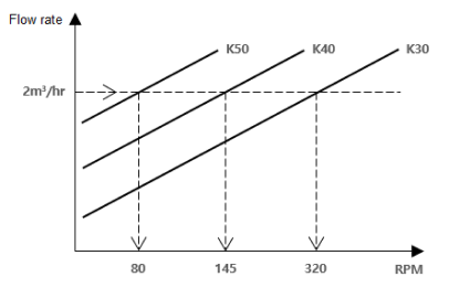 To obtain a pump with a capacity of 2m³/hr, find the 2m³/hr point on the vertical axis of the graph, move it horizontally, then you will find the intersections with each performance graph of K50, K40, K30.