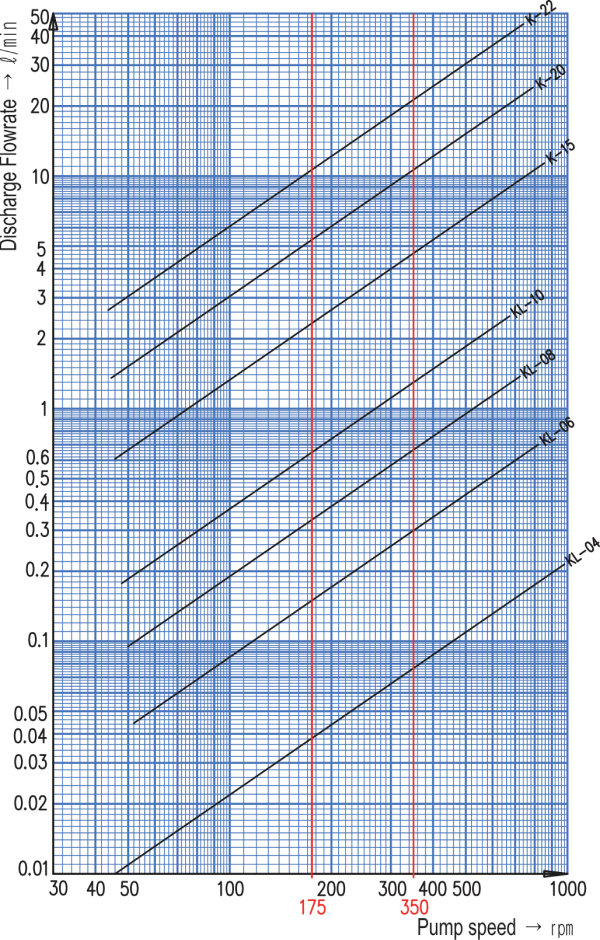 - The red line is the pump rotation speed of 350rpm(5:1) and 175rpm(10:1), when using commonly used motors (4 poles, 60Hz) and reducers (5:1, 10:1)