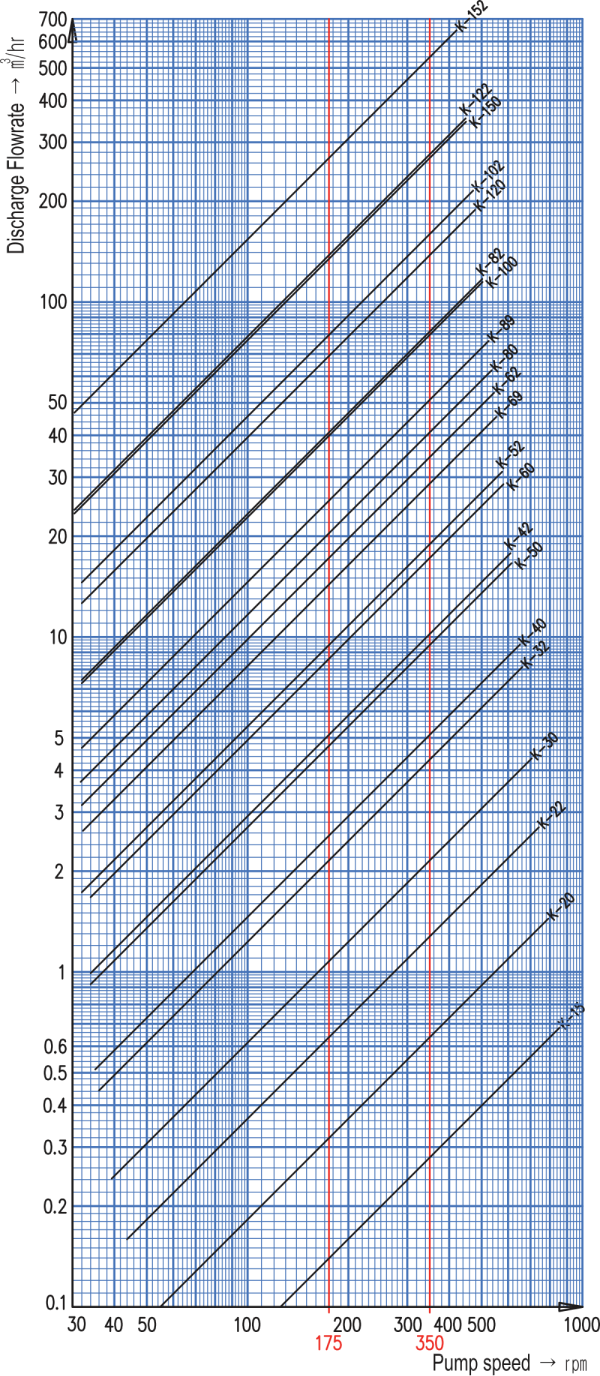 Among the several models that can satisfy the required discharge flow rate on the graph, the pump is selected primarily by examining whether the rotation speed is within the proper speed rangefor the transfer liquid. The final decision is made in consideration of the need for speed variation and available reducer and speed variator.